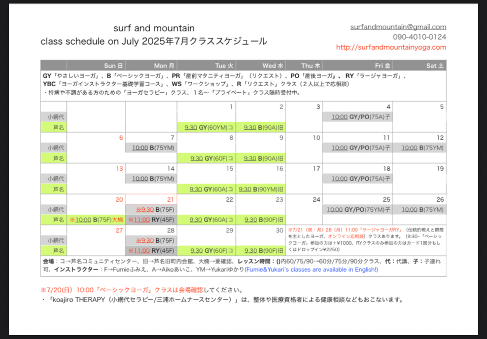 2025年 7月クラススケジュール Class schedule on July 2025