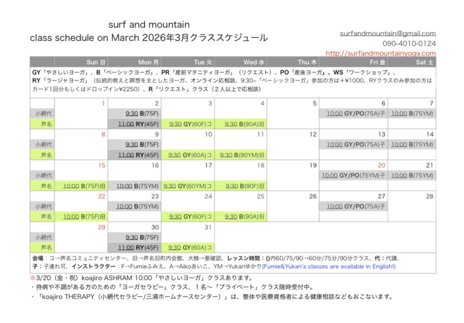 2026年 3月 クラススケジュール class schedule on March
