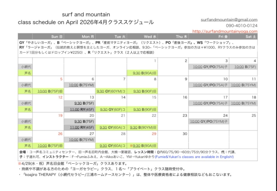 2026年 4月 クラススケジュール class schedule onApril 2026